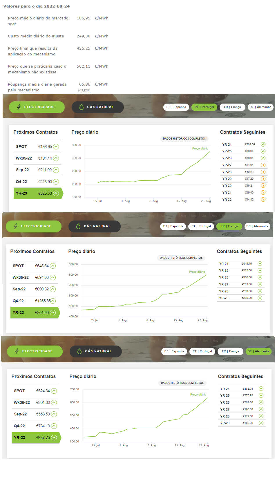 Por cá, num país à beira-mar plantado, como sempre o silêncio habitual do "logo resolvemos", quando o mercado diário de energia fecha hoje (preços para amanhã) a uns singelos 436,25€ (mecanismo de ajuste incluído). Caso não tivéssemos este mecanismo já estaríamos a pagar a 502,11€ / MWh (Poupança média de 13,12%) mas, dos 249,30 do ajuste, o consumidor elegível para o pagamento do mesmo não se livrará.