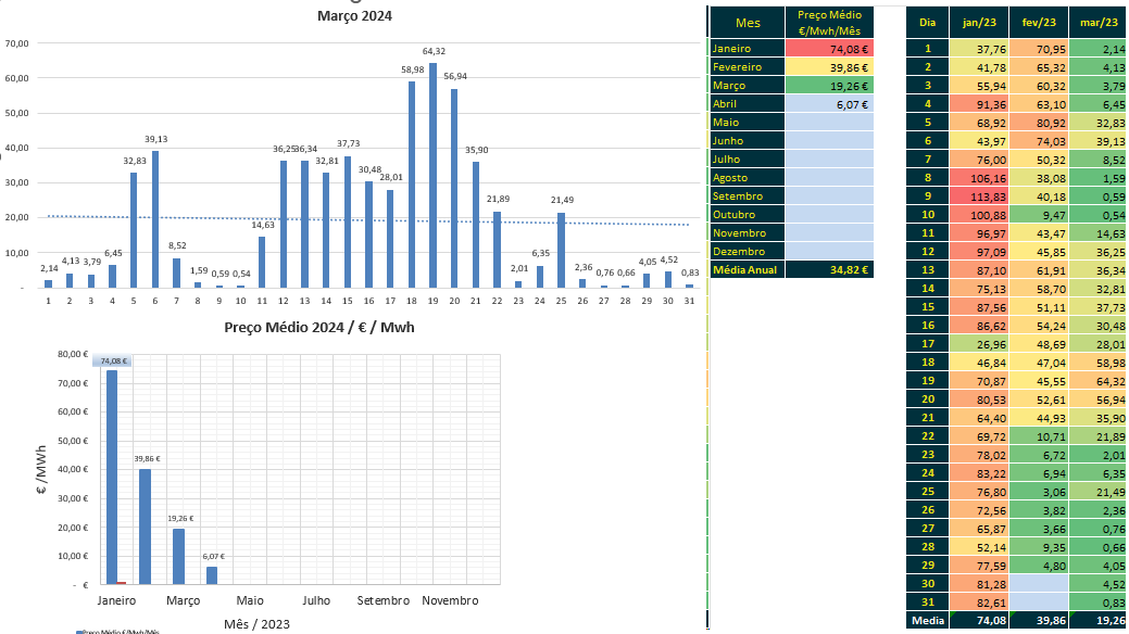 Apenas 3 meses, não consecutivos, desde 2010 que tiveram um preço médio mensal de energia abaixo dos 19,26€/Mwh registados no mês de março de 2024. Esses meses foram abril de 2013 (16,08€/Mwh), fevereiro de 2014 (15,39€/MWh) e Abril de 2020 (17,77€/MWh).